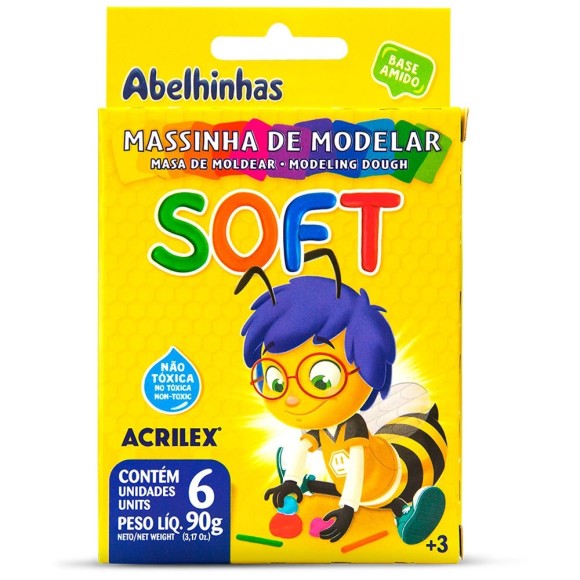 A Massinha de Modelar 6 Cores Soft da Acrilex é perfeita para liberar a criatividade em trabalhos de modelagem. Super macia e fácil de manusear, ela não mancha as mãos e pode ser reaproveitada várias vezes, garantindo diversão e aprendizado sem fim. Ela é fabricada à base de amido, o que a torna segura e não tóxica, ideal para crianças e adultos. Sua textura macia facilita a modelagem de diversas formas e figuras, proporcionando uma experiência agradável e criativa.