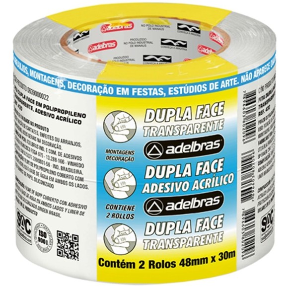 A Fita Dupla Face Transparente 48mm x 30m - Pacote com 2 rolos da Adelbras é perfeita para fixação de cartazes, enfeites, arranjos e outras decorações. Ideal para montagens e uso geral em festas, estúdios de arte ou agências de propaganda, esta fita oferece praticidade e discrição, pois não aparece após a aplicação.