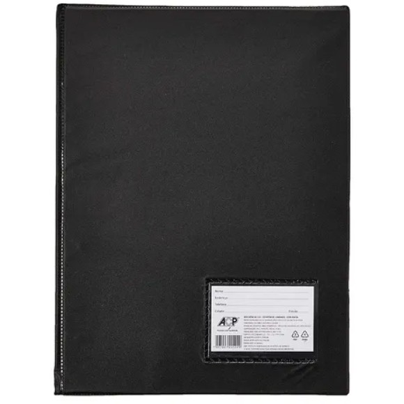 A Pasta Catalogo Oficio Preta 122 da ACP possui 50 envelopes plásticos finos, tamanho oficio e fixação por 4 colchetes, permitindo alterar a quantidade de plásticos. Ideal para organização de trabalhos e documentos, portfólio, catálogos, mostruários de venda, relatórios, etc.