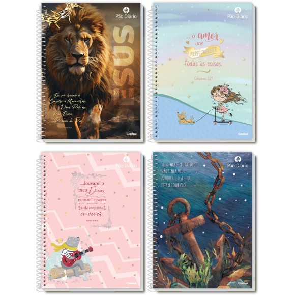 O Caderno 10 Matérias Pão Diário Teen da Credeal combina qualidade, praticidade e inspiração. Com capa dura resistente, acabamento em laminação fosca, hot stamping e verniz localizado, o caderno possui design sofisticado e moderno. Seu interior decorado traz ainda mini cartões personalizados, além de uma bolsa de papel decorada para organizar documentos. As estampas inspiradas em salmos tornam o produto ainda mais especial, ideal para quem busca funcionalidade e motivação no dia a dia.