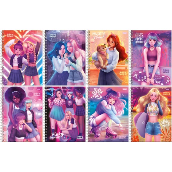 O Caderno Amigas para Sempre 20 Matérias 320 folhas possui capa dura com laminação fosca com super hot stamping, bolsa de papel decorada para guardar trabalhos e anotações, folha de adesivos, folhas pautadas decoradas e espiral. Ideal para o dia a dia na escola ou faculdade.