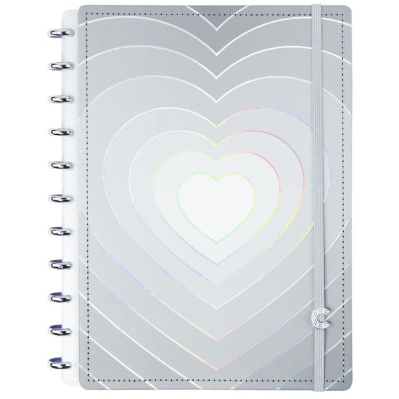 O Caderno Inteligente Grande Grey Love da Caderno Inteligente contém um brilho super sofisticado em formato de coração com hotstamping holográfico. Capture as memórias, objetivos e sonhos tudo em um único lugar! Se apaixone! Com discos prateados e um interior cinza, o caderno combina sofisticação e estilo em um só lugar. Descubra a beleza das combinações.
