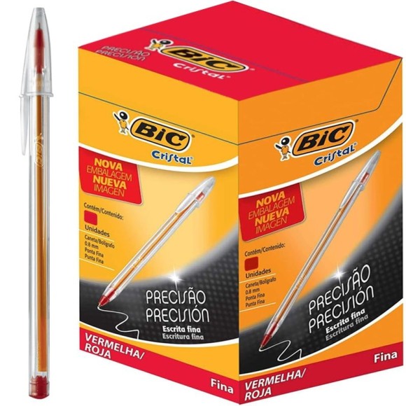 Caneta Esferográfica 0.8mm Cristal Precisão Fina Vermelha c/100 Bic