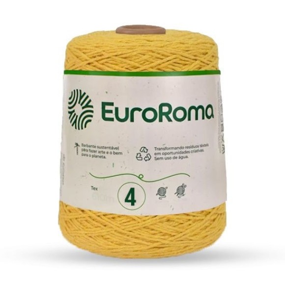 Barbante EuroRoma N.4 600g - Amarelo Ouro da Eurofios é ideal para quem busca qualidade, sustentabilidade e versatilidade em seus trabalhos manuais. Produzido com 85% de algodão e 15% de outras fibras, é perfeito para diversas técnicas como crochê, tricô, macramê, tear, tapeçaria e artesanato em geral, agregando beleza e resistência às suas criações.