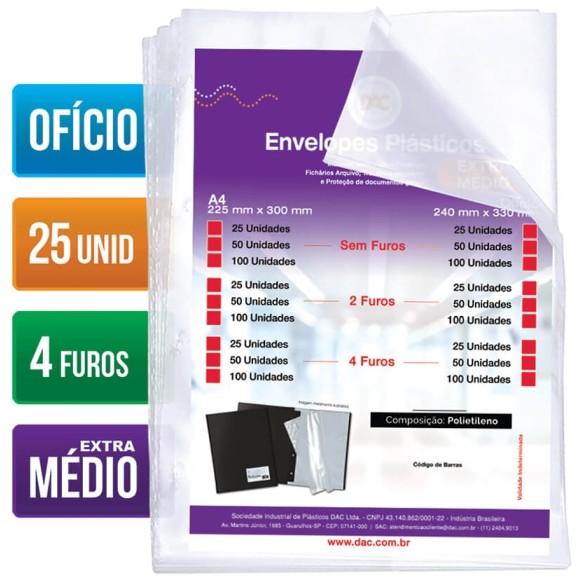 Saco Plástico 4 Furos com 25 Envelopes Extra Médios 5178 DAC